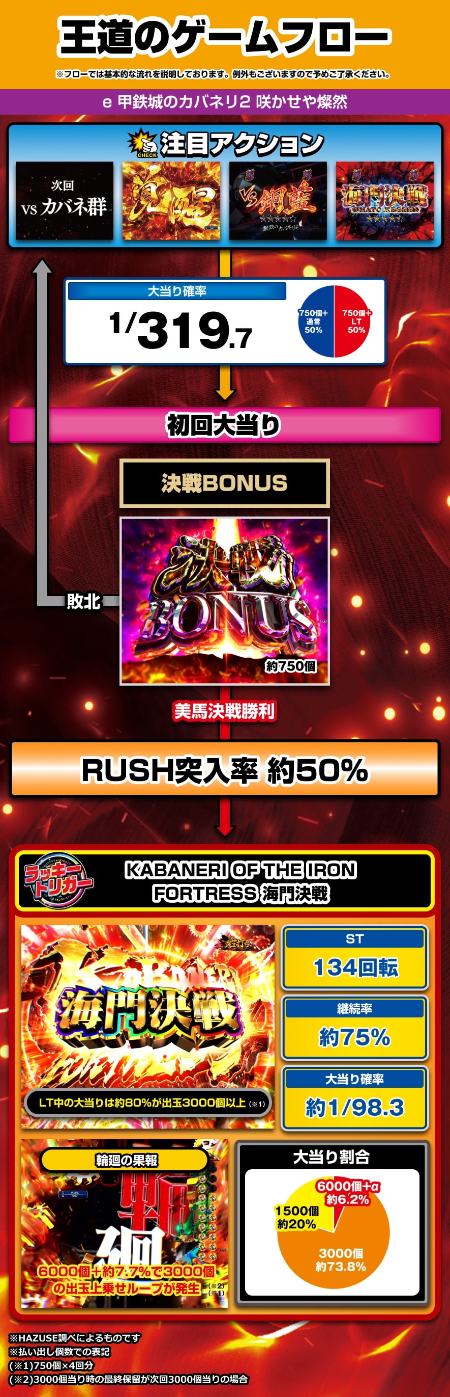 大当り時の約80%が3000個(※1)以上となり、「輪廻の果報」発生時は6000個(※2)+約7.7%で3000個(※1)の出玉上乗せループが発生する。
