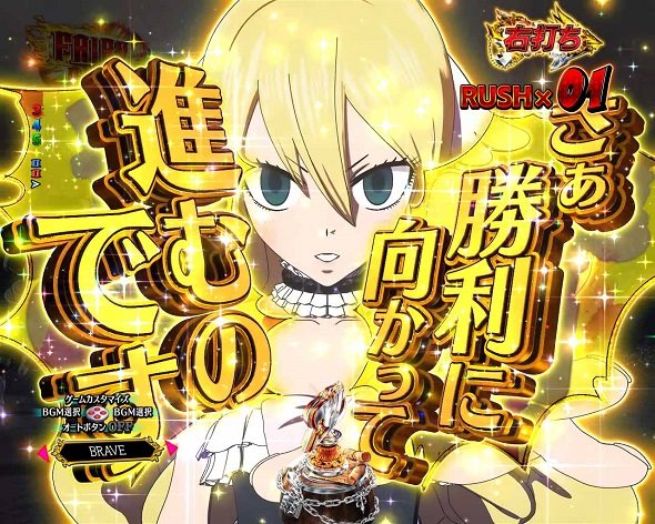 VS国崩しのブランディッシュ・μ ルーシィ勝利で大当り濃厚。 VS死神ブラッドマン ガジル勝利で大当り濃厚。 VS審判者ワール・イーヒト ラクサス勝利で大当り濃厚。 妖精の輝き(フェアリーグリッター) アニメバトルSPリーチハズレ後に発展の可能性があり、魔水晶(ラクリマ)を破壊できれば大当り濃厚。 アジィール撃破リーチ 3回発生するバトル演出に全て勝利できれば大当り濃厚。 ※HAZUSE調べによるものです。