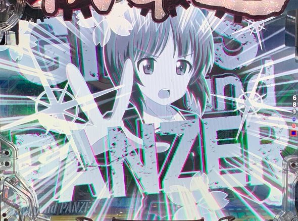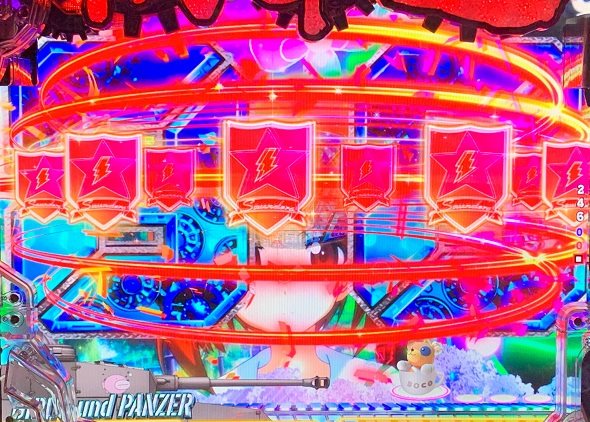 戦車道RUSH中の演出 主に運命の戦車道の演出成功から突入するモード。戦車道RUSH終了後に当て勝つ革命へ突入した場合はST回数をリセットし、14回転以内に当った場合は出玉約3000個+上乗せ約50%となる「無限軌道」へ必ず当選する。戦車道RUSHの継続期待度は約80%(※ST14回転の引き戻し率約61.2%+残保留4個引き戻し率約47.2%の合算値、特図2に限る)。 ※HAZUSE調べによるものです。