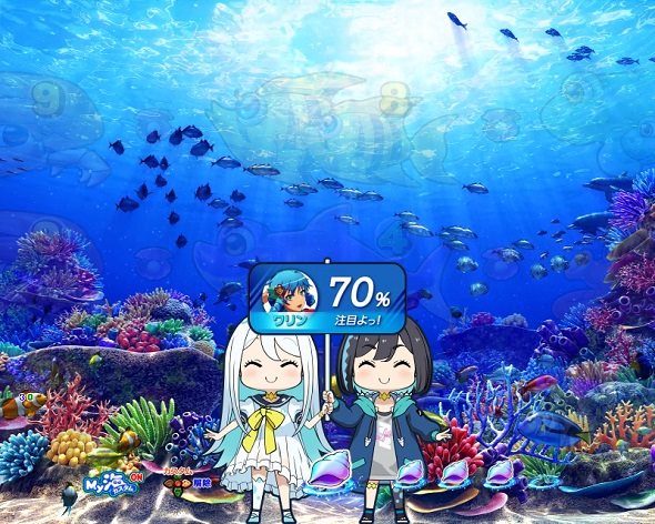 泡/大泡予告 大泡出現なら期待度アップ。 魚群予告 発生すれば期待度大幅アップ。 背景キャラ通過予告 変動中に背景を通過するキャラで期待度が変化する。 黒潮リーチ シングルラインから発展する可能性があり、潮の流れが早いと期待度アップ。 珊瑚礁リーチ シングルラインから発展する可能性があり、珊瑚礁の位置が高いと期待度アップ。 マリンちゃんリーチ ダブルラインから発展する可能性があり、火鈴が登場すれば期待度大幅アップ。 ※画像は兄弟機のものを含みます。※HAZUSE調べによるものです。