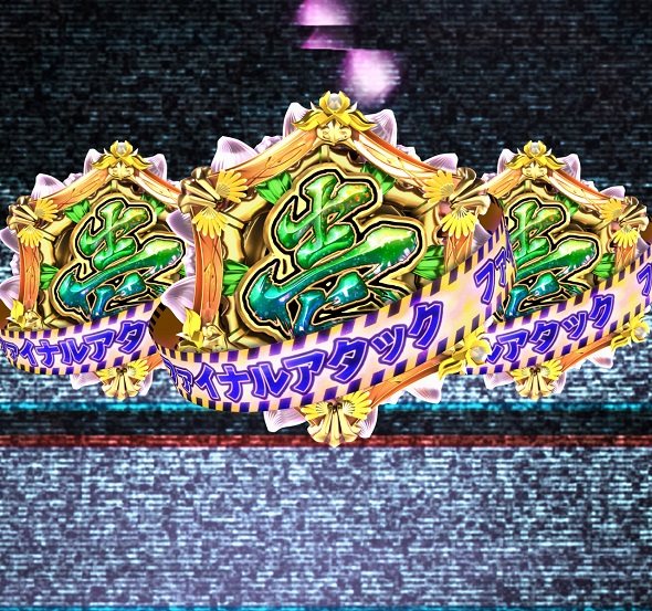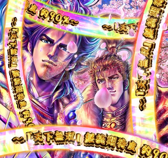 天下無双モード 特定演出出現時の大当り後に突入する上位モード。参・七図柄揃いで継続濃厚。参・七以外の図柄揃いで「ファイナルアタックBONUS」となり、連打成功で「天下無双モード」へ復帰する。天下無双モードの継続期待度は94%。 ※HAZUSE調べによるものです。