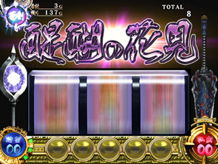 ■概要蒼剣ラッシュ(AT)へは、規定ゲーム数消化・通常時に成立したレア小役の一部・鬼の試練(CZ)中のAT抽選当選時、覚醒の試練(CZ)中のAT抽選当選時に突入する。※覚醒の試練成功時の蒼剣ラッシュ(AT)は89%ループが確定する。蒼剣ラッシュ(AT)は1セット約50G+α(40G+継続バトル+上乗せG数)継続し、継続抽選非当選までループする。(最大89%ループ)1Gあたりの純増枚数は約2.8枚。※蒼剣ラッシュ(AT)のゲーム数消化後は幻魔京バトル(継続バトル)によって継続の当否が告知される。幻魔京バトル(継続バトル)中のレア小役成立時は、蒼剣ラッシュのストック獲得抽選が行われる。蒼剣ラッシュ(AT)中のレア小役成立時は、ゲーム数上乗せ抽選・醍醐の花見突入抽選・島左近バトル抽選が行われる。※ゲーム数上乗せには「直乗せ」・「水晶ストック(後乗せ)」の2種類が存在する。※島左近バトル勝利で桜玉(+100G以上)を獲得&桜花狂乱チャレンジ発生。チャレンジ成功で桜花狂乱(上乗せ特化ゾーン)へ突入。