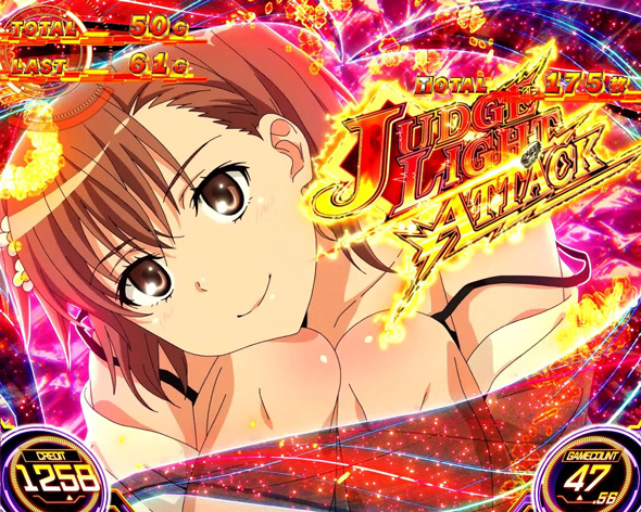 AT中も通常時同様に超電磁砲コインが鍵を握り、コイン揃い時はG数上乗せ+約1/3で特化ゾーン「JUDGE LIGHT ATTACK」に当選する。