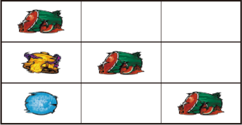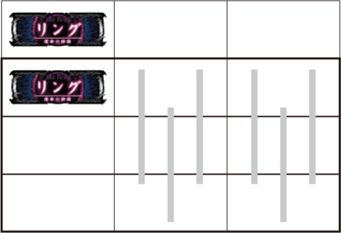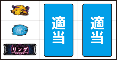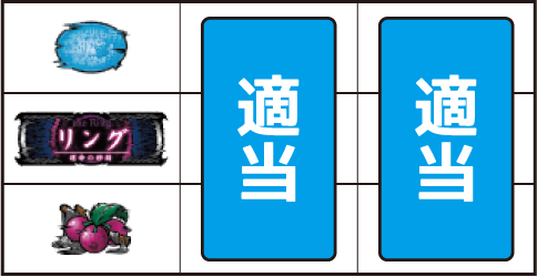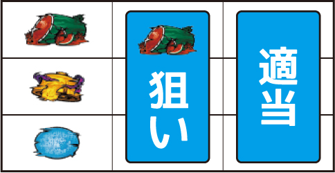 左リール枠上~上段にBARを狙う ▼左リール下段にチェリー停止時 【成立役】弱チェリー or 強チェリー 中・右リール適当打ちでOK。※右リール中段にボーナス図柄 or チェリー非停止=弱チェリー※右リール中段にボーナス図柄 or チェリー停止=強チェリー 【弱チェリー】 【強チェリー】 ▼左リール下段にBAR停止時 【成立役】ハズレ or リプレイ or ベル or チャンス目A 中・右リール適当打ちでOK。※リプレイ・ベルのダブルテンパイハズレ=チャンス目A 【チャンス目A】 ▼左リール上段にスイカ停止時 【成立役】スイカ or チャンス目B or スベリベル 中リールにスイカを狙い、右リール適当打ちでOK。(中リールのスイカはBARを目安に)※スイカ揃い=スイカ※スイカハズレ=チャンス目B※中段ベル=スベリベル 【スイカ】 【チャンス目B】 【スベリベル】 ー