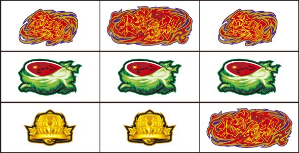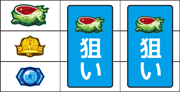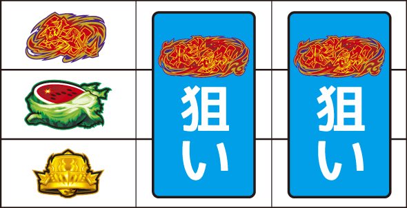 左リール枠上~上段に北斗無双図柄を狙う 【Point】本機は通常時に変則打ちすると、各種抽選が冷遇される可能性があるので注意。 ▼左リール下段にチェリー停止時 【成立役】チェリーor無双チェリー 中・右リール適当打ちでOK。※中・右リール中段にベル停止=チェリー※中・右リール中段にベル非停止=無双チェリー 【チェリー】 【無双チェリー】 ▼左リール下段に北斗無双図柄停止時 【成立役】ハズレorリプレイorベルorチャンスベルorチャンス目or無双目 中・右リール適当打ちでOK。※ベルの小V字停止=チャンスベル※中段に[リプレイ・リプレイ・チェリーorスイカ]停止=チャンス目※北斗無双図柄と無双図柄の一直線=無双目 【チャンスベル】 【チャンス目】 【無双目】 ▼左リール上段にスイカ停止時 【成立役】スイカorチャンス目 中・右リールにスイカを狙う。(スイカは北斗無双図柄を目安に)※スイカテンパイハズレ=チャンス目 【スイカ】 【チャンス目】 ▼左リール中段にスイカ停止時 【成立役】無双スイカ 中・右リールに北斗無双図柄を狙う。※中段スイカ揃い=無双スイカ 【無双スイカ】