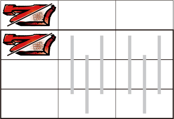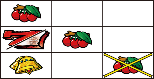 左リール枠上~上段に赤7or⑲番の白7を狙う ▼左リール上段にチェリー停止時 【成立役】弱チェリーor強チェリー 中・右リール適当打ちでOK。※下記以外=弱チェリー※3連チェリー停止=強チェリー 【弱チェリー】 【強チェリー】 ▼左リール上段に赤7or⑲番の白7停止時 【成立役】ハズレorリプレイorベル 中・右リール適当打ちでOK。 ▼左リール下段にサソリ停止時 【成立役】サソリ 中リールにサソリを狙い、右リール適当打ちでOK。(中リールのサソリは青7を目安に) 【サソリ】