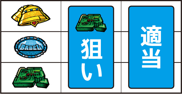 ▼「×・?・?」ナビ発生時中or右リールを押し、残りのリールは適当打ちで消化する。▼技術介入ナビ発生時技術介入ナビ発生時は逆押し適当打ち後、左リール枠内に2連白7を狙う。(4コマ引き込み)成功でベルナビ回数を1個獲得する。▼押し順ナビ発生時押し順ナビに従い、リールを停止させる。▼上記以外通常時の打ち方で消化する。