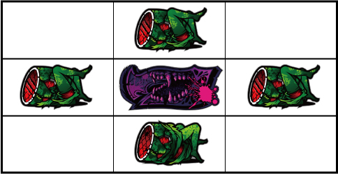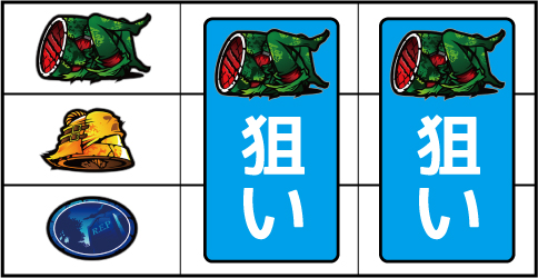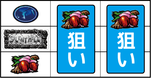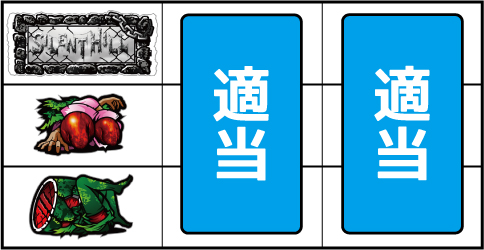 左リール枠上付近にバーを狙う ▼左リール枠内にスイカ停止時 【成立役】弱スイカ or 強スイカ or 最恐目 中・右リールにスイカを狙う。(中リールのスイカは紫7、右リールはバーを目安に狙う)※スイカ斜め揃い=弱スイカ※スイカ並行揃い=強スイカ※中リール紫7停止=最恐目 【弱スイカ】 【強スイカ】 【最恐目】 ▼左リール下段にチェリー図柄停止時 【成立役】弱チェリー or 強チェリー 中・右リールにチェリーを狙う。(中・右リールのチェリーはバーを目安に狙う)※右リール中段リプレイ図柄停止=弱チェリー※3連チェリー=強チェリー 【弱チェリー】 【強チェリー】 ▼左リール中段にチェリー停止時 【成立役】最恐目 中・右リール適当打ちでOK。 ▼左リール下段バー停止時 【成立役】ハズレ or ベル or リプレイ or 弱チャンス目 中・右リール適当打ちでOK。 【弱チャンス目】
