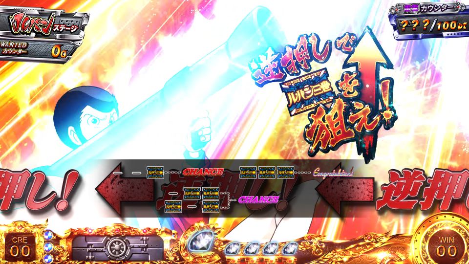 基本的に適当打ちでOK。(小役の取りこぼしはなし) ※メインリール中段に[次元][五エ門][ルパン]のブランク図柄が揃えばMB入賞。MB成立後は2G連続で10枚役が成立する。液晶上の出目として青図柄のみ、赤図柄のみ、いずれかのラインに7が停止の3パターンが出現した場合、チャンス目となる。▼メインリールを狙え演出発生時逆押しでメインリールにルパン三世図柄を狙う。
