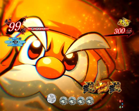 連続予告 継続図柄が停止すると発生し、3連目まで継続すれば「善悪の見極」へ発展する。 善悪の見極 連続予告が3連目まで継続すると発生し、プッシュボタンから発展先を決定する。 扇カットイン予告 激喝柄が出現すれば期待度大幅アップ。 乞うご期待予告 善悪の見極から発生する期待大の予告。 ※画像は兄弟機のものを含みます。※HAZUSE調べによるものです。