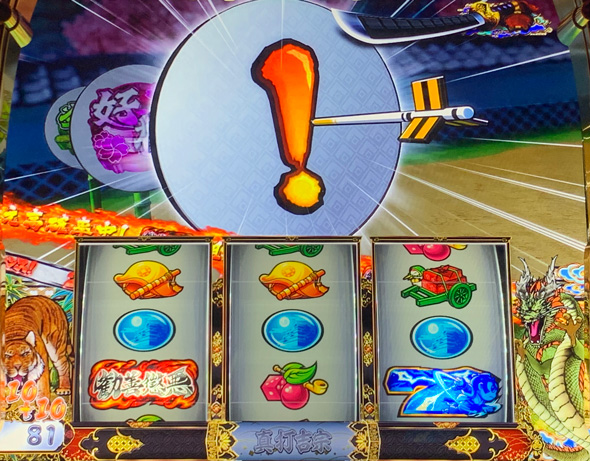 リールロック3段階でフリーズ濃厚となり、W家紋インパクトが発生=真BBの1G連獲得濃厚となる。