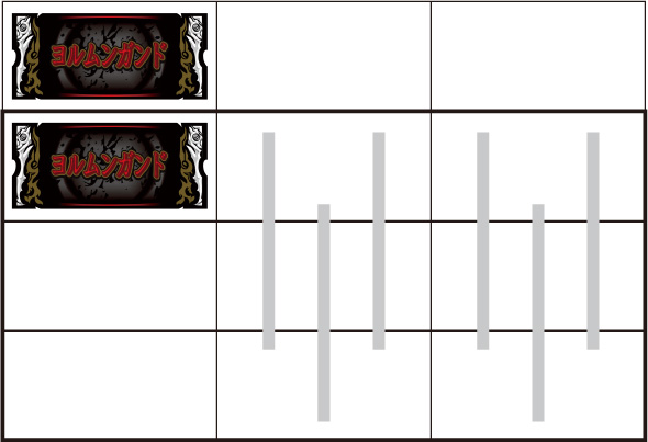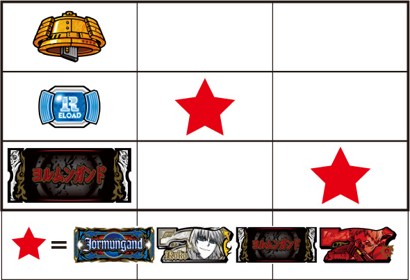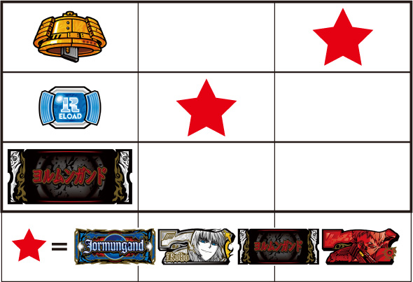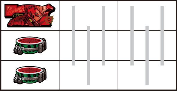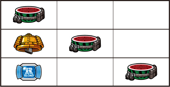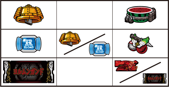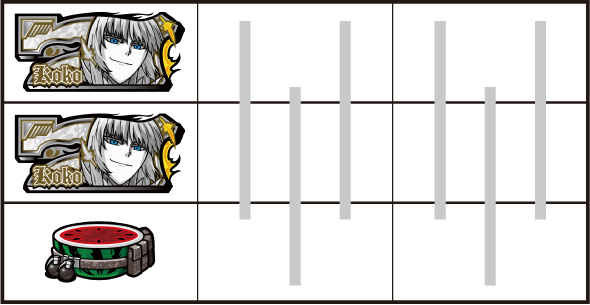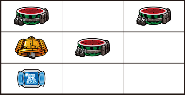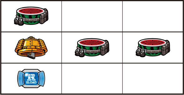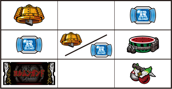 左リール枠上~上段にBARを狙う ▼左リール中段にチェリー停止時 【成立役】中段チェリー 中・右リール適当打ちでOK。(狙えばBARが揃う) ▼左リール下段にチェリー停止時 【成立役】弱チェリーor強チェリー 中・右リール適当打ちでOK。※右リール中段にリプレイ停止=弱チェリー※右リール中段にボーナス図柄/BAR図柄停止=強チェリー 【弱チェリー】 【強チェリー】 ▼左リール下段にBAR停止時 【成立役】ハズレorリプレイorベルorチャンス目orリーチ目 中・右リール適当打ちでOK。※ベル小V停止=チャンス目 【チャンス目】 ▼左リール上段にスイカ停止時 【成立役】スイカorチャンス目orリーチ目 中リールにスイカを狙い、右リール適当打ちでOK。※スイカハズレ=チャンス目※スイカ小V停止=リーチ目 【スイカ】 【チャンス目】 代表的なリーチ目一例 ー