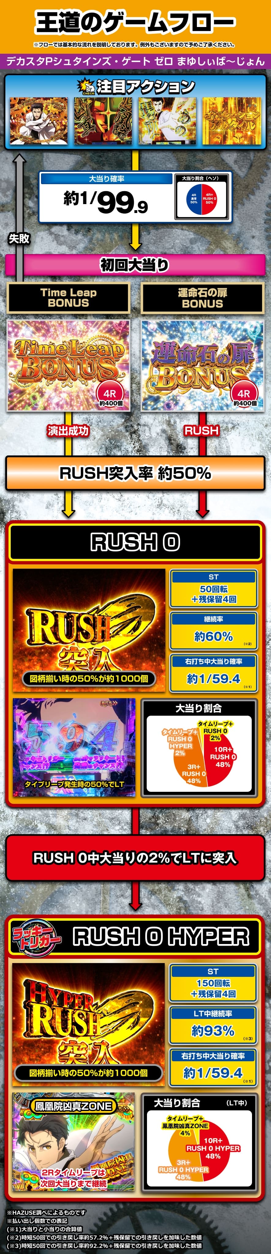 岡部の執念を表現したシリアス系演出が主体のRUSH。 「タイムリープ」発生時の50%でラッキートリガーである上位RUSH「RUSH 0 HYPER」へ突入する。