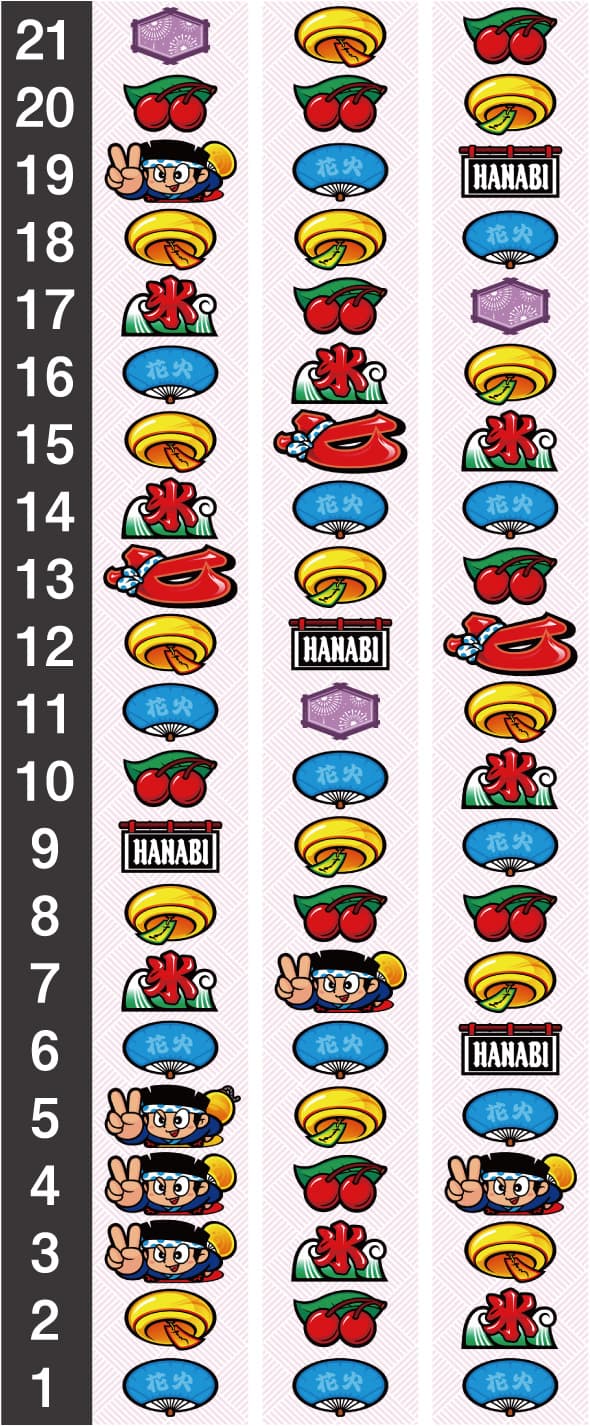 設定差のある小役確率 設定 風鈴A 風鈴B 風鈴合成 設定1 1/12.9 1/38.4 1/9.68 設定2 1/12.5 1/38.7 1/9.45 設定5 1/12.1 1/36.2 1/9.06 設定6 1/11.5 1/34.5 1/8.64 設定 チェリーA1 チェリーA2 設定1 1/99.4 1/21.0 設定2 1/99.4 1/19.4 設定5 1/99.4 1/20.5 設定6 1/99.3 1/19.6 設定 チェリーB 氷A 設定1 1/307.7 1/46.3 設定2 1/306.2 1/47.3 設定5 1/300.6 1/46.2 設定6 1/297.9 1/47.4 設定差のない小役確率 フラグ 全設定共通 リプレイ 1/7.3 氷B 1/1560.4 各フラグの特徴 フラグ 特徴 風鈴A/B 狙う箇所によって停止形が異なる チェリーA1 赤7BIGと同時当選する可能性がある(チェリー付きリーチ目が出現しやすい) チェリーA2 チェリーのメインフラグでたまやチャレンジには発展しない チェリーB 打ち上げ系花火フラッシュが発生たまやチャレンジ発展の可能性がある 氷A 平行ラインに揃いやすい 氷B 斜めラインに揃いやすい ※HAZUSE調べによるものです。